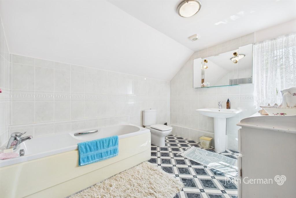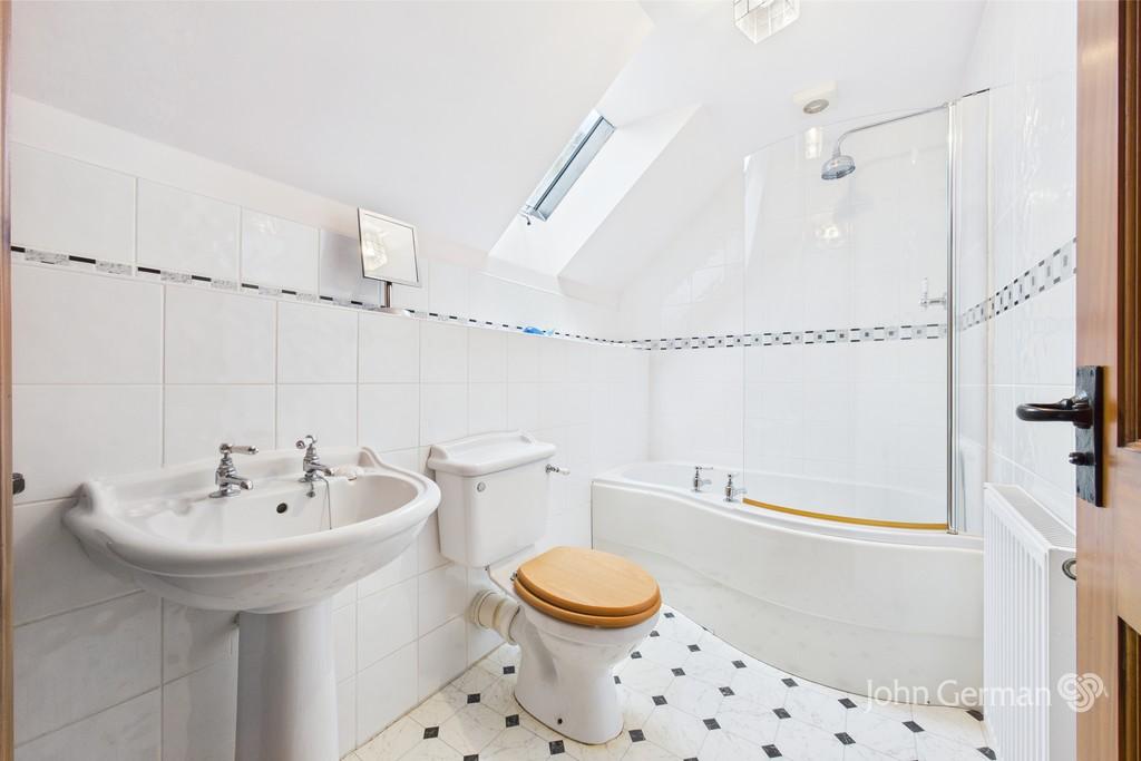 Finally, there is the family bathroom, originally planned and a bedroom, having a white suite and majority tiled walls.