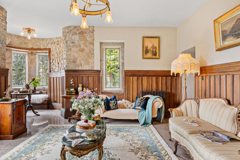 The Turret Room, a truly unique feature of the house, sits on the opposite side of the entrance hall and is a place of real architectural delight. The curved part of the room is accentuated by three deep-set windows with stone mullions and built-in window seats, creating a peaceful and elevated vantage point from which to enjoy the surrounding landscape. A door from here leads into the gunroom a more intimate space with panelling and a fireplace perfectly suited as a cosy snug, media room, or office.