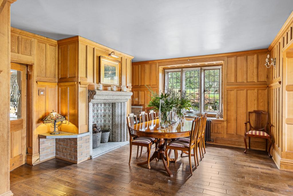 From the reception hall, the principal living rooms flow with ease. To one side, the drawing room offers a superb setting for entertaining, panelled walls with sprung timber floors and a wide five-pane window that captures uninterrupted views across the open moor. This space opens into the dining room, equally grand and finished to the same exacting standard, making it ideal for formal occasions or relaxed family dinners.