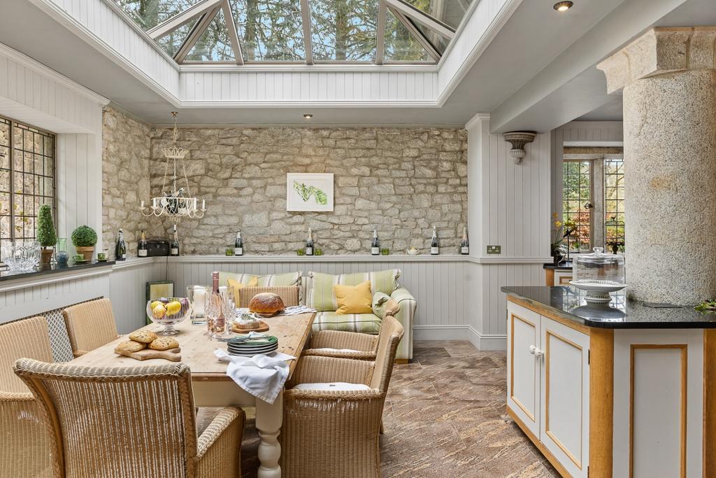 At the heart of the home lies the kitchen, which blends traditional craftsmanship with contemporary comfort. Handmade in oak and centred around a five-oven AGA, the space is anchored by a beautifully carved granite pillar forming the base of the central island. The adjoining breakfast room area is wrapped in exposed granite and topped with a large glass lantern, allowing natural light to flood in. A utility room sits conveniently nearby, providing practical support to this well-planned space.