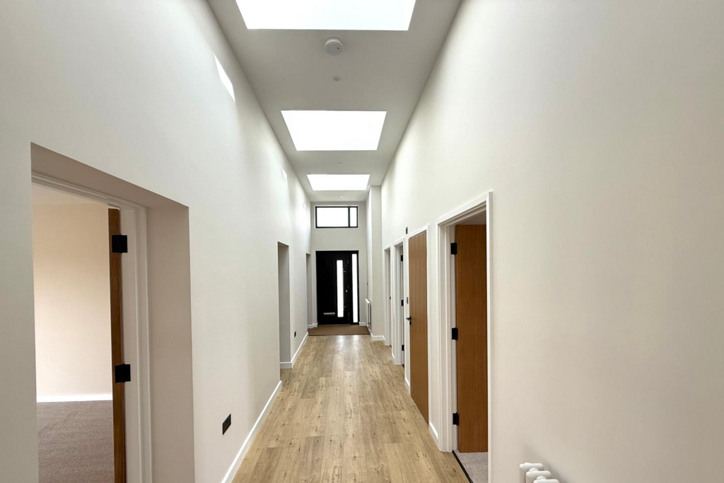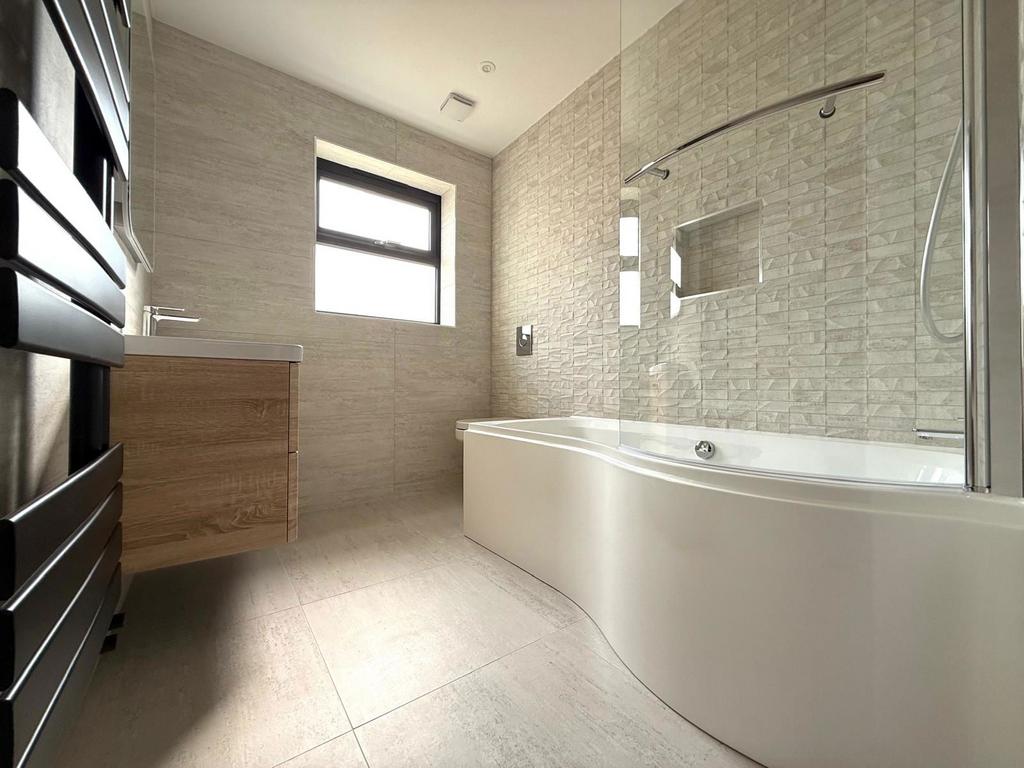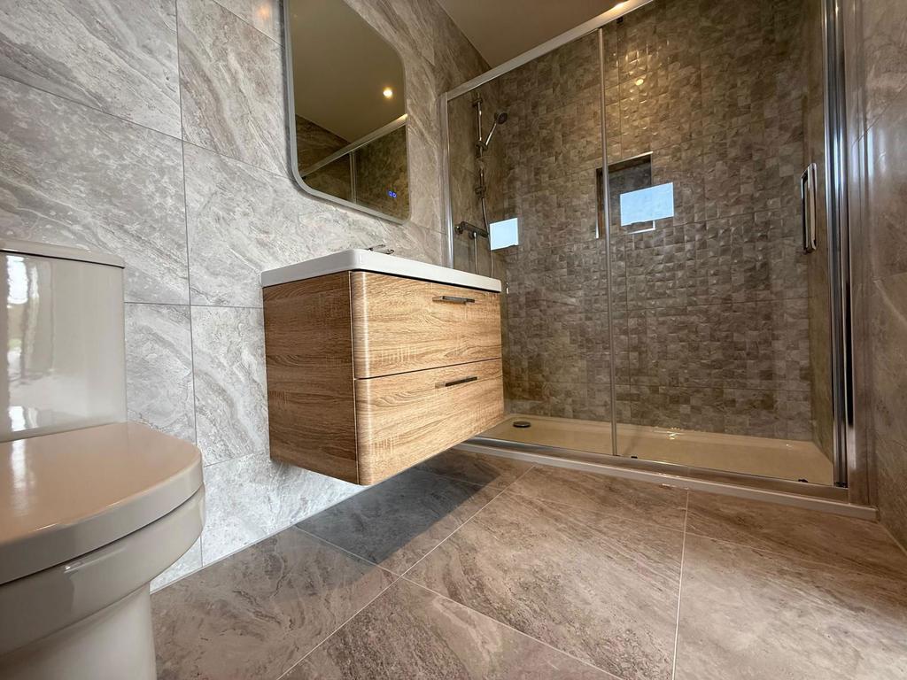The bungalow features three generously sized bedrooms, including a beautifully appointed master suite complete with a stylish en-suite bathroom fitted with Porcelanosa tiles, a walk-in shower, and a Vado vanity unit. A separate family bathroom mirrors this high standard, boasting Porcelanosa tiling, a Vado unit, a hung toilet, and a shower-over-bath.