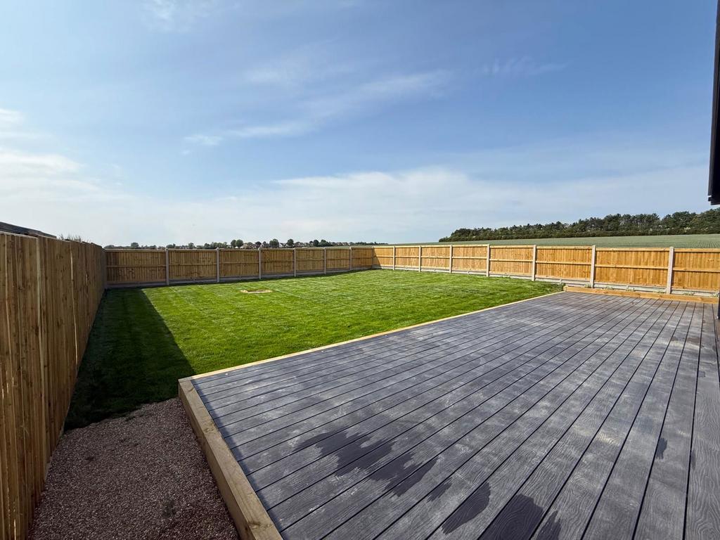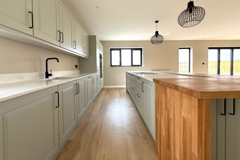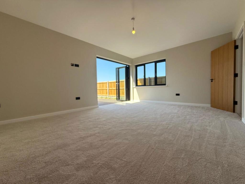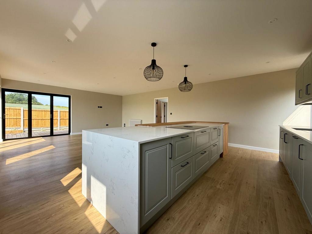At the heart of the home is a stunning open-plan living and kitchen area, flooded with natural light and perfect for modern family living and entertaining. The bespoke Blossom Avenue kitchen is finished to an impeccable standard, featuring Quartz worktops, a Bosch double oven with integrated microwave/oven, a Bora induction hob, and full-height integrated fridge and freezer, along with a built-in dishwasher. A breakfast bar comfortably seats up to six people, making it a functional and stylish centrepiece. Bi-folding doors lead directly out onto the rear decking area, providing seamless indoor-outdoor living and spectacular countryside views.