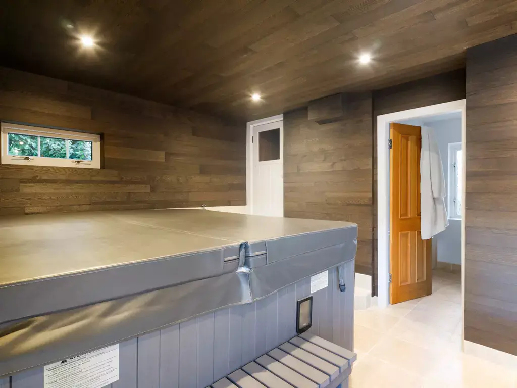 On the first floor, the property offers further versatile living spaces including a sitting room, a living room currently used as an office, and a spacious family/entertainment room. A dedicated wellness area features a therapy/treatment room, sauna, and en-suite, providing a private sanctuary within the home.