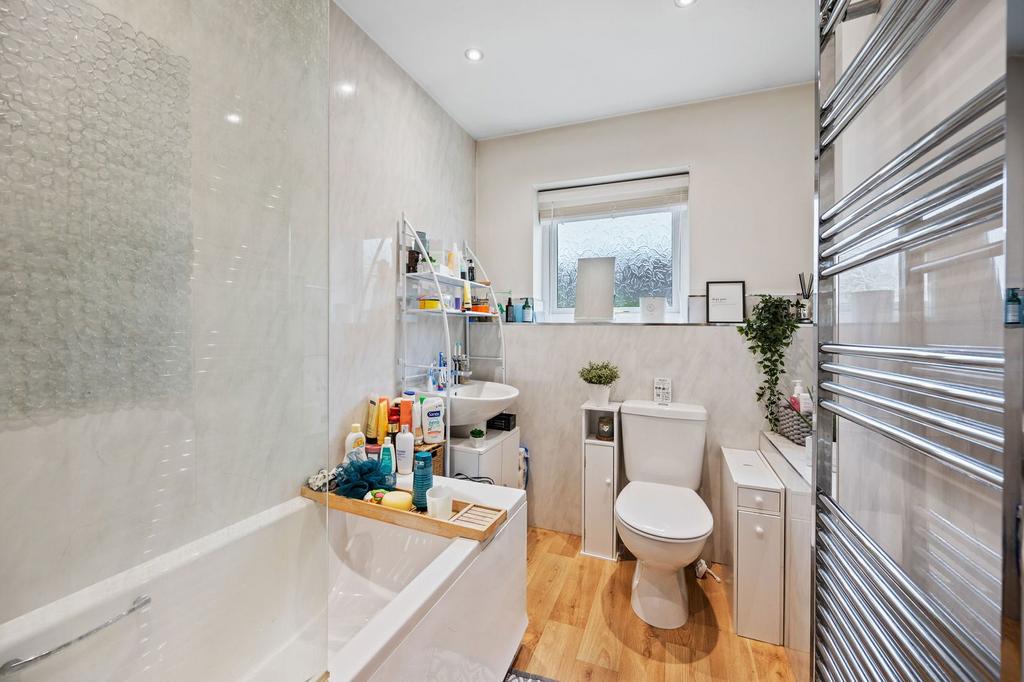 - Bathroom - suite comprising low level WC, pedestal wash hand basin with mono bloc tap, panel enclosed bathtub with rainfall shower and glass shower screen, splash backs and heated towel rail