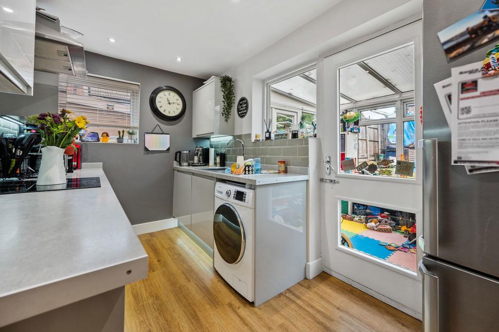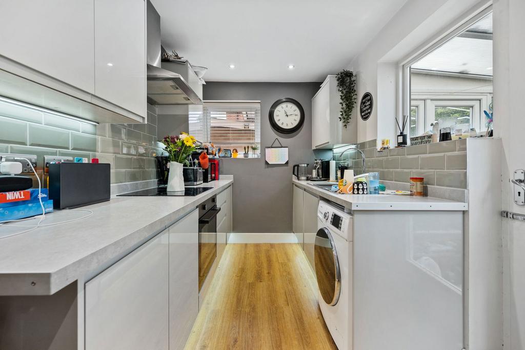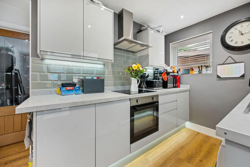 - Kitchen - is modern fitted with a range of base and eye level units, one and a half bowl single drainer sink with mono bloc tap inset to worktops, integrated oven and four ring gas hob with extractor, space for fridge/freezer and washing machine (appliances are negotiable), ceramic tiled splash backs and high quality Karndean flooring
