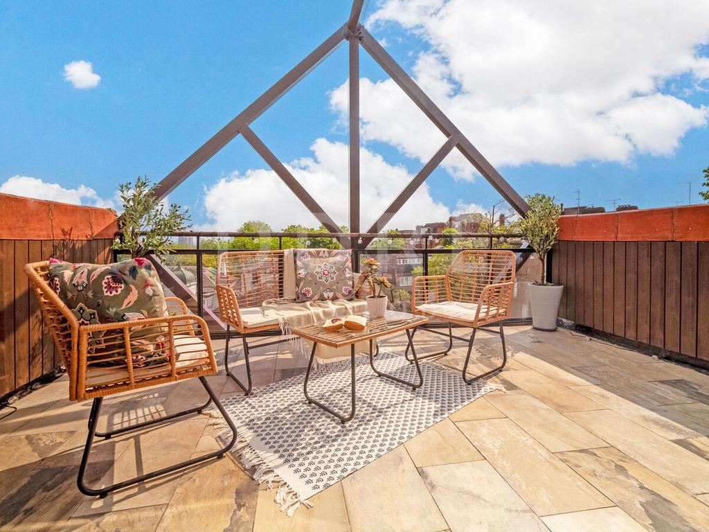 The upper levels house generous sleeping quarters, crowned by a sun-drenched roof terrace offering spectacular London views. The luxurious principal suite commands an entire floor, creating a tranquil retreat with exceptional volume and illumination. Three additional bedrooms share a well-appointed family bathroom. This is complemented by a large integral garage, delightful patio garden, convenient utility/guest WC, and abundant storage throughout.