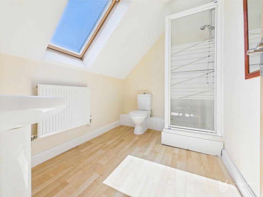 Velux double glazed window. Radiator. Vinyl flooring. Extractor fan. Suite compromising of shower cubicle with tiled enclosure, wash hand basin with tiled splashback and W.C.