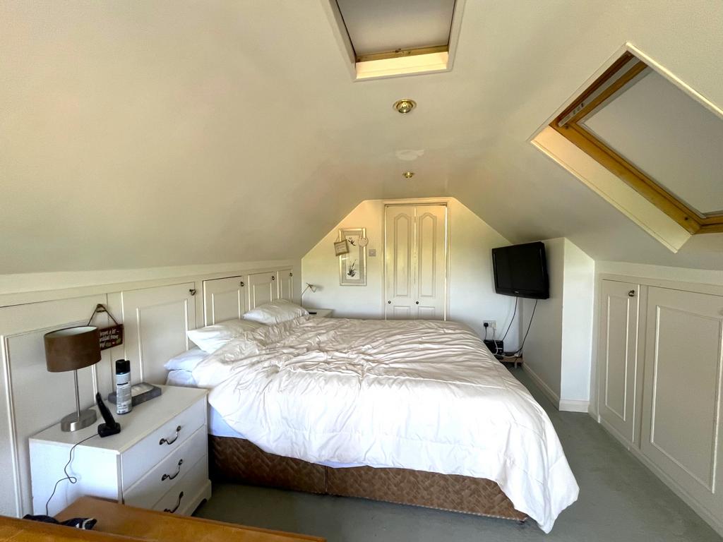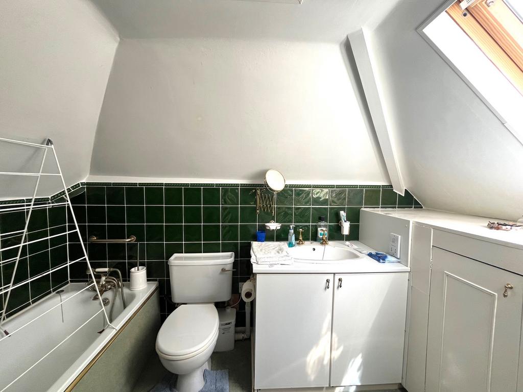 BEDROOM 1 (S & W): 15’6” (4.73m) x 9’4” (2.86m) plus eaves storage. TV aerial point, sloping ceilings with south facing Velux window, radiator, telephone point. Door to: EN-SUITE BATHROOM/W.C.: Fully tiled walls, panelled bath with mixer tap/shower attachment, low level W.C., vanity wash basin, shaver point, shelved cupboard, towel radiator, sloping ceiling with south facing Velux window.