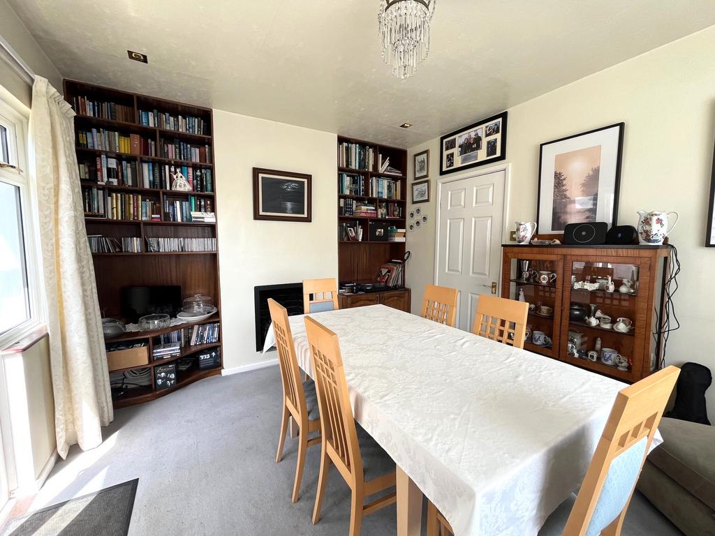 DINING ROOM (S & E): 14’10” (4.53m) into bay x 10’11” (3.33m) into alcoves. Radiator, telephone point, cupboards and shelving to alcoves, fireplace, double glazed door to patio.