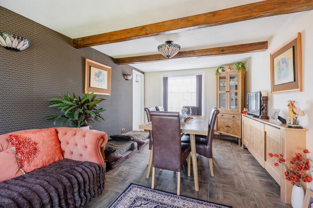 A third reception room sits off the hallway, currently used as a dining room, it could equally serve as a ground floor bedroom. The space features a front-facing window, French doors opening onto the rear garden, exposed beams, a built-in cupboard, and tiled flooring.