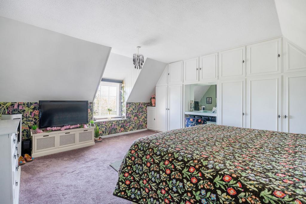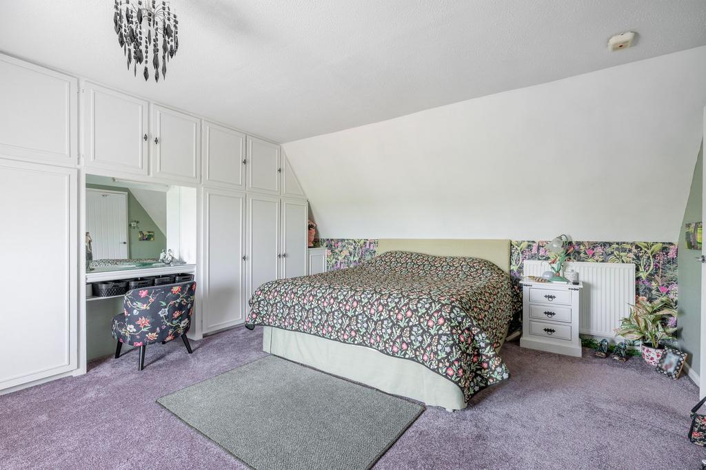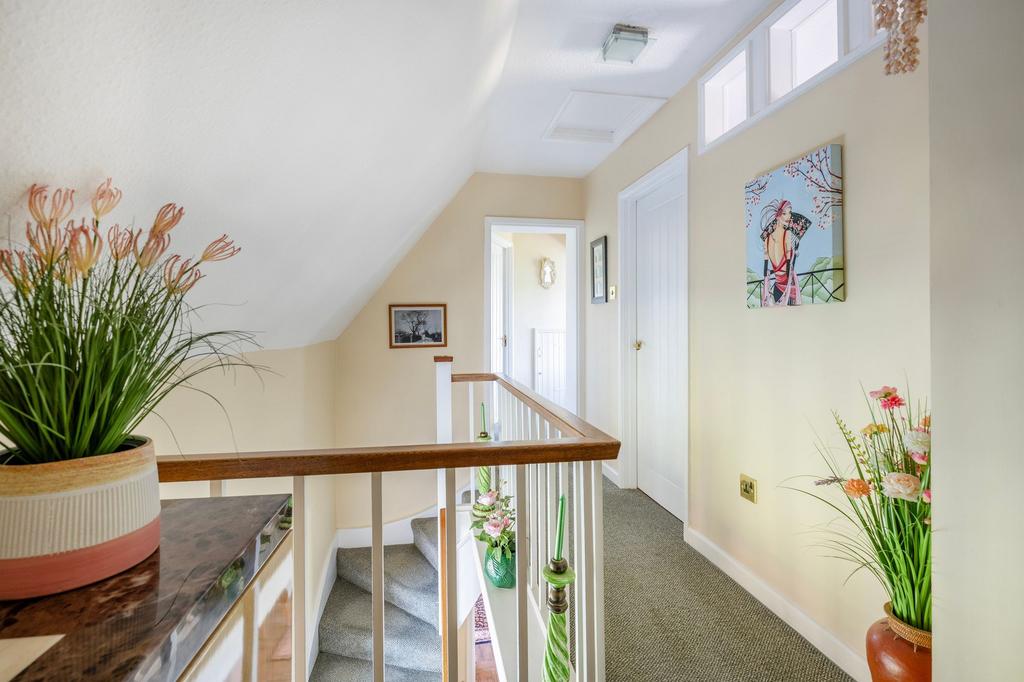 Upstairs, the landing includes a useful storage cupboard and provides access to three spacious double bedrooms, with the main enjoying built-in wardrobes and far-reaching countryside views. This floor is well laid out for family living, offering plenty of room for furnishings and storage.