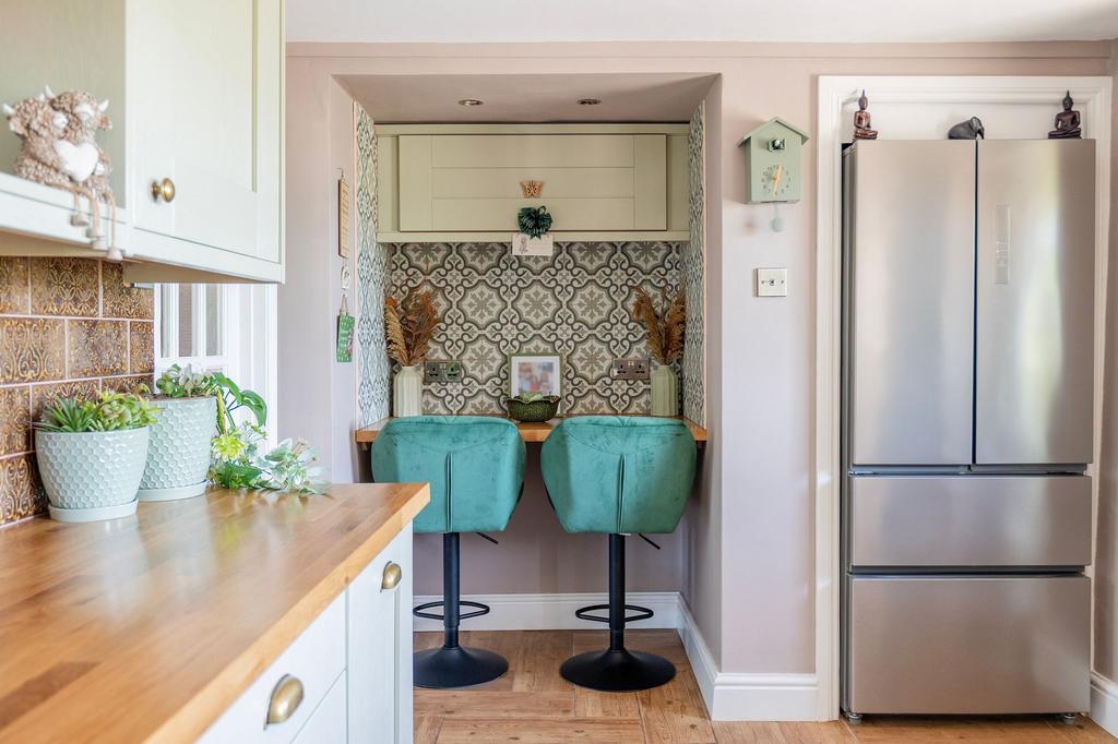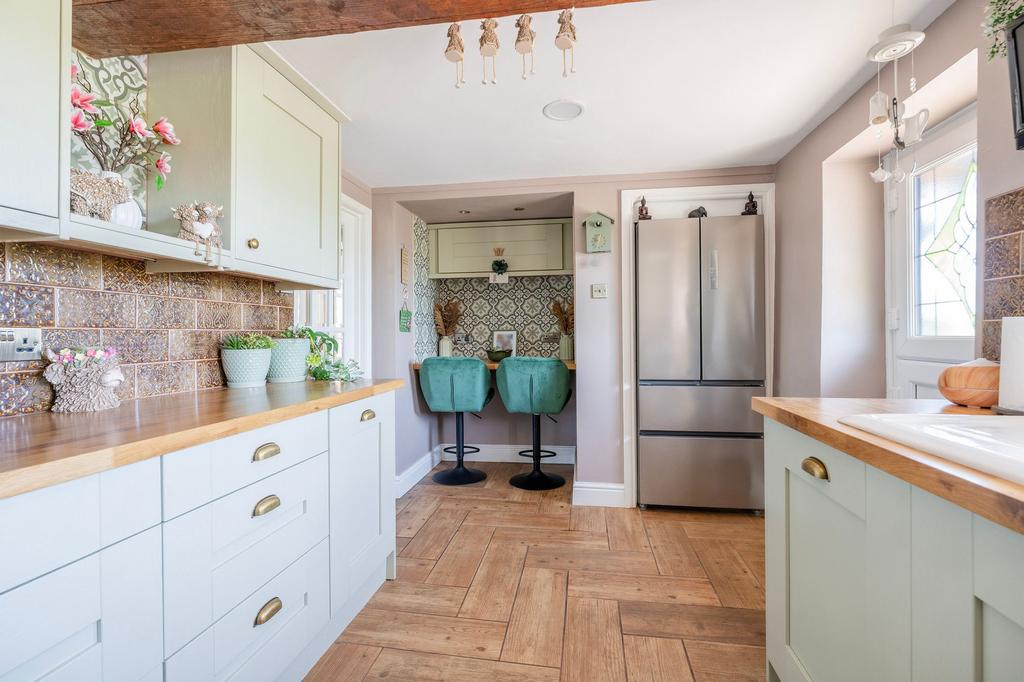 Step through the stable-style front door into the kitchen, a stylish and well-appointed space featuring recently re-fitted Shaker-style units, solid wood worktops, and a ceramic sink with mixer tap.A tiled backsplash complements the cabinetry, while feature tiling around the breakfast bar adds a subtle touch of character. Exposed wood ceiling beams enhance the charm of the room, and a breakfast bar offers a convenient spot for casual dining. Integrated appliances include an electric oven, ceramic hob, extractor, and dishwasher. The kitchen also enjoys field views to the front, offering a peaceful rural outlook.
