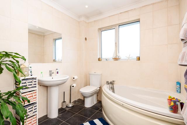 BATHROOM: fully tiled walls and floor with white suite comprising: corner panelled bath, low level wc, pedestal wash hand basin with mixer tap, shower enclosure, heated towel rail, spot lights.