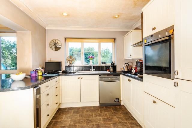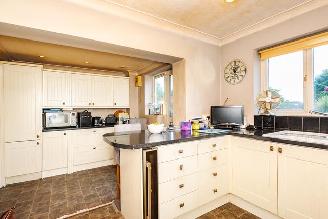KITCHEN/BREAKFAST ROOM: 17’8” x 9’8”. roll edge working surfaces with inset 1 1/2 bowl single drainer sink unit with mixer tap, space and plumbing for dishwasher, range of base cupboards and drawers with wall mounted unit above, integrated fridge/freezer, electric oven, 4 burner gas hob and extractor hood over, breakfast bar, radiator, further working surface with base cupboards and drawers under, wall mounted units above and larder unit, spot lights, power points, glazed door to rear garden, door to: