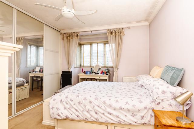 BEDROOM 1: 14’ into square bay x 10’7” plus fitted wardrobes with sliding doors to length of one wall, large walk in cupboard, radiator, telephone point, power points, door to: