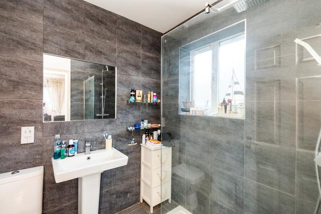 EN SUITE SHOWERR ROOM: fully tiled walls and floor with white suite comprising: shower enclosure, pedestal wash hand basin with mixer tap, electric shaver socket over, low level wc, heated towel rail, extractor fan, window.