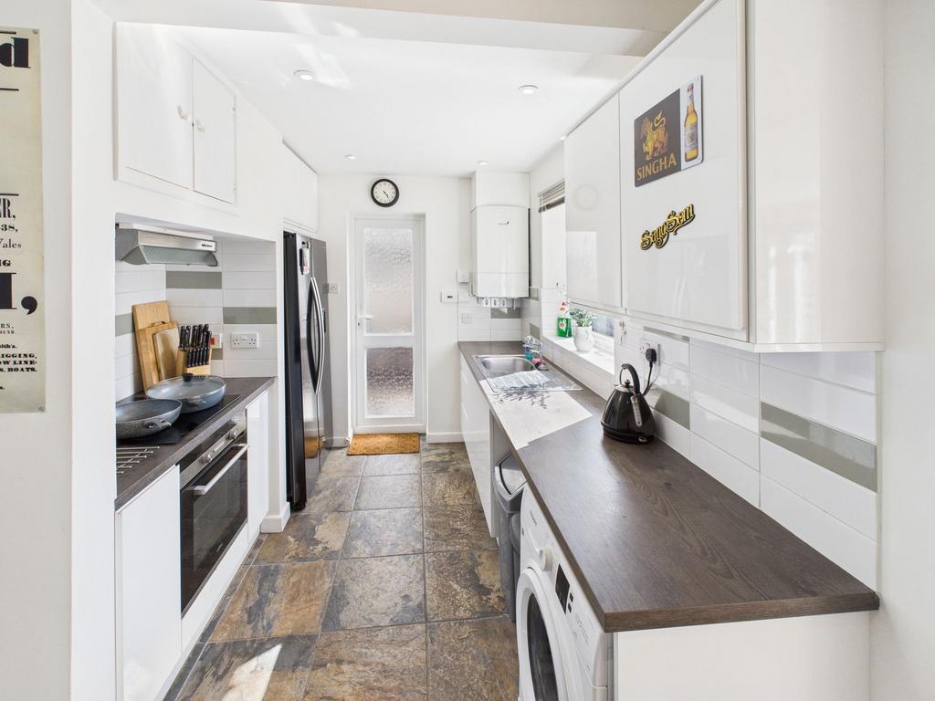 Window to the rear aspect and door to the side aspect. Radiator, breakfast bar and wall mounted units to one wall creating a breakfast area. The remainder of the kitchen has a range of wall and base mounted units with worktop over, built in over an induction hob with extractor hood over and fridge freezer. Space and plumbing for washing machine as well as single bowl sink with taps over. Boiler mounted to wall.