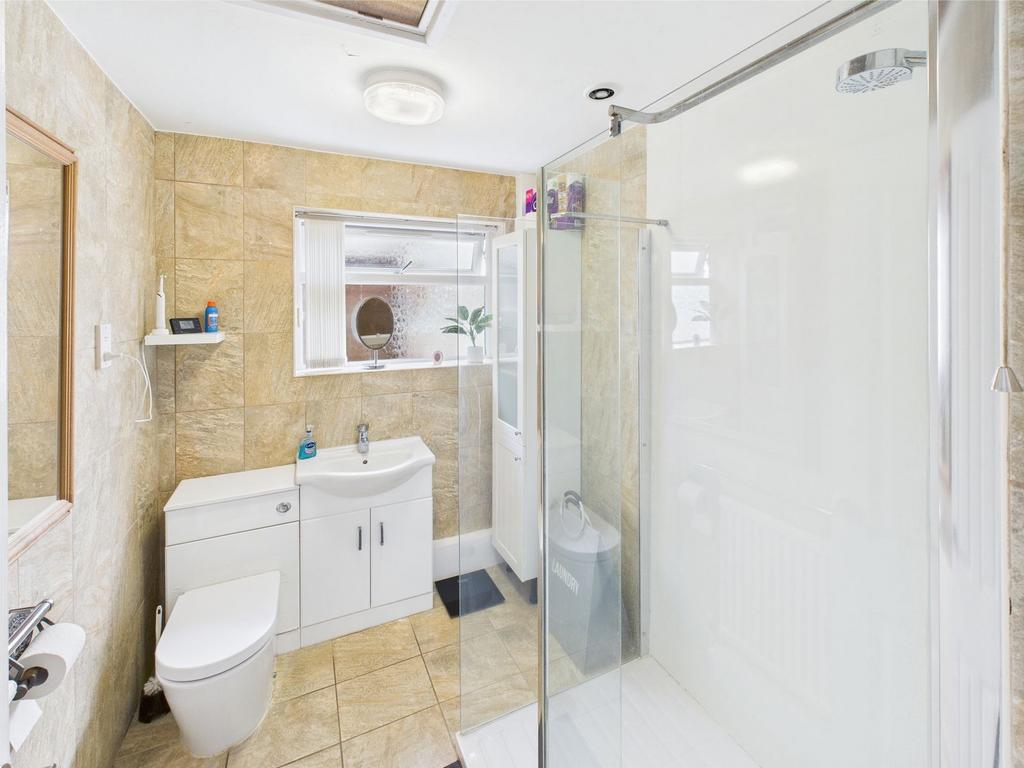 Window to the side aspect, fully tiled floor and walls, radiator, loft access and suite comprising of built in wc, basin and double shower cubicle.