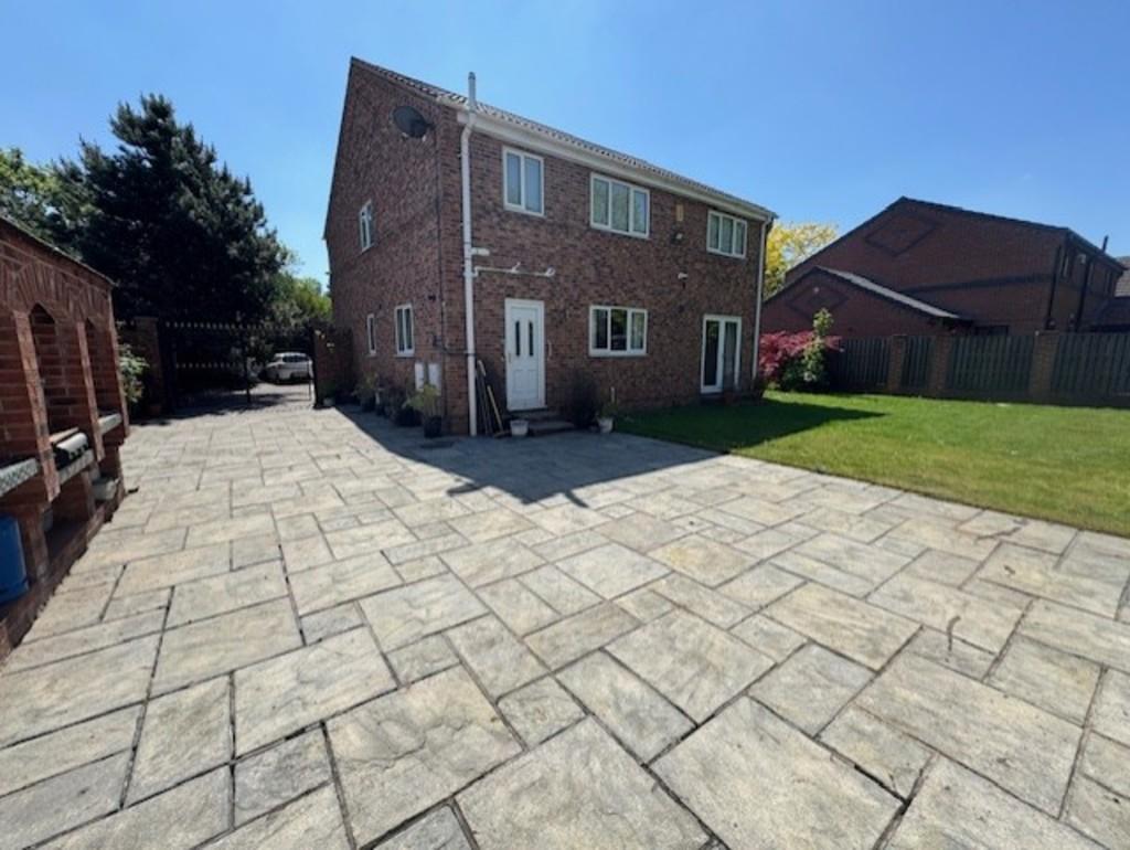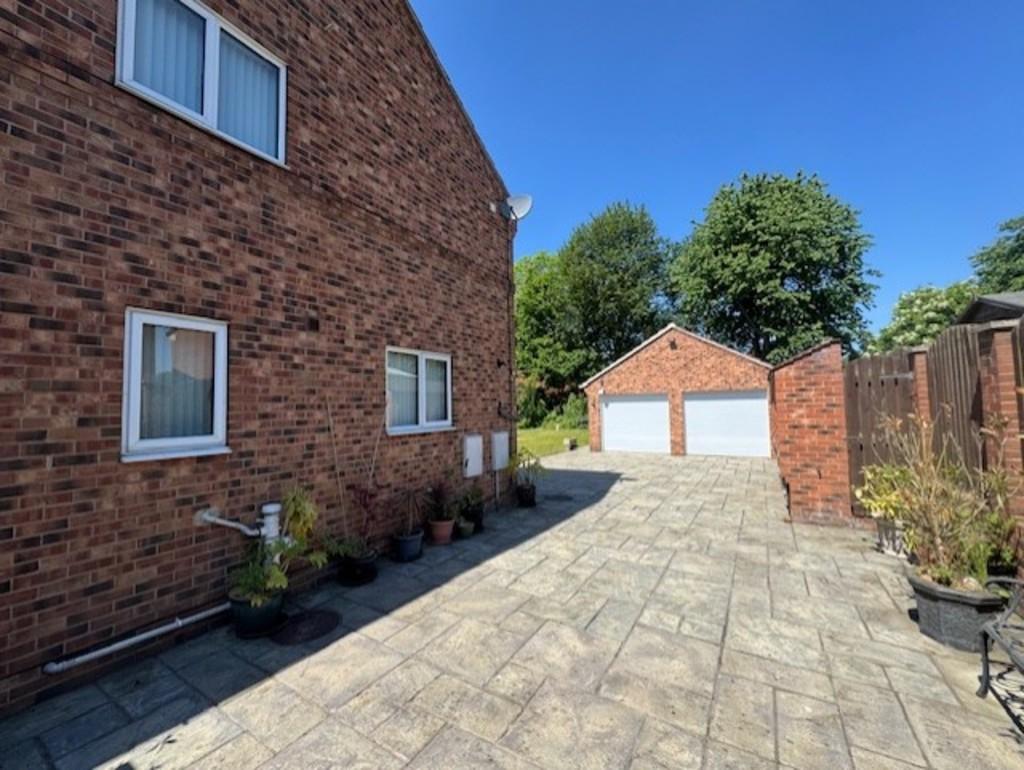 REAR Flagged driveway to the double garage and brick built barbeque area with sink ,drainer and mixer tap.