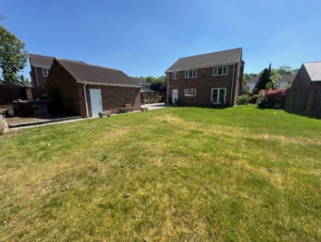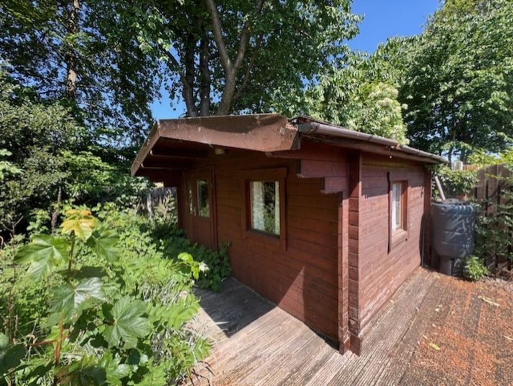 Large fully enclosed lawned garden with pond, decking seating area and a timber summerhouse.