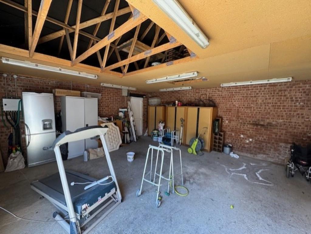 DOUBLE GARAGE Brick built and having electric powered roller doors and a pull down ladder to roof storage.