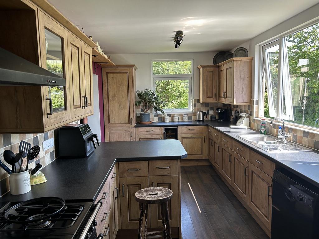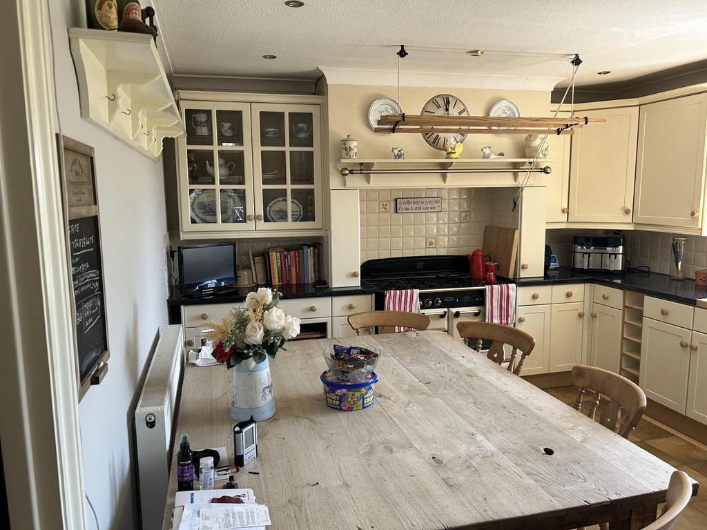 Kitchen and Dining Room (18'7 x 9') with fitted high and low units, one and a half bowl sink and large window with views over farmland.