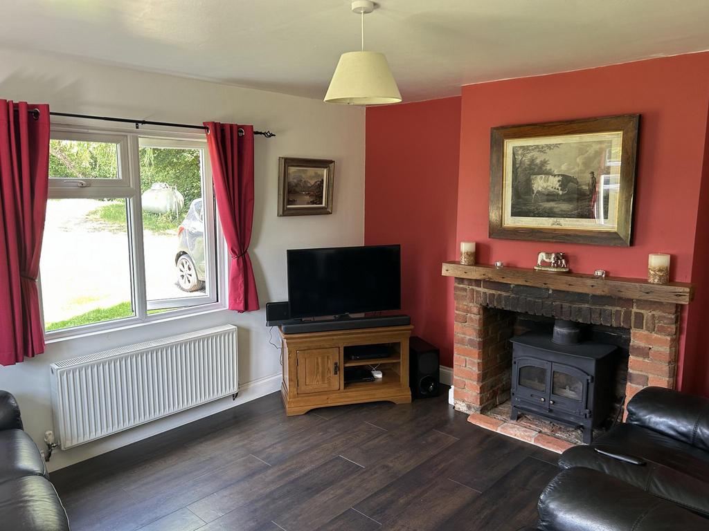 Living Room (13'11 x 11'7) with feature brick surround fireplace solid fuel burner and wooden floor.