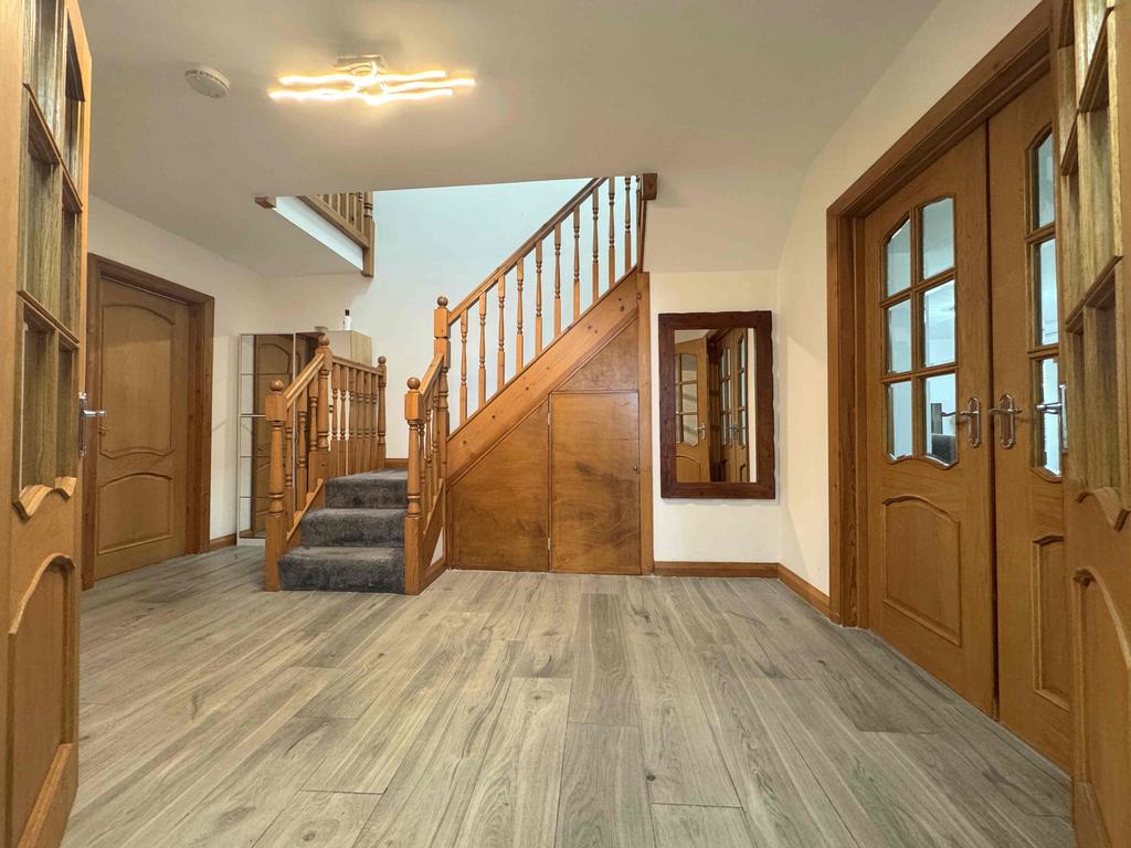 A welcoming grand entrance hall with an open staircase, understairs storage, wood-effect laminate flooring, and a radiator.