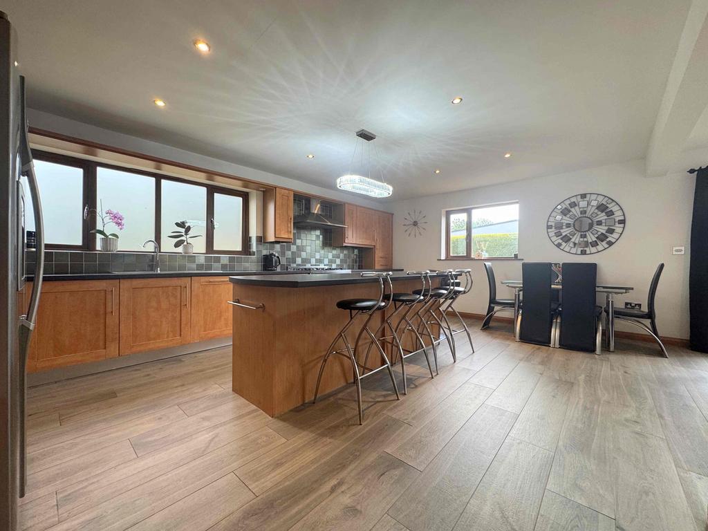 Modern fitted kitchen including a one-and-a-half bowl sink with chrome mixer tap and splashback tiles. Appliances include an integrated dishwasher, a built-in cooker, and an extractor fan. There is also space and plumbing for an American-style fridge freezer. A kitchen island unit includes a breakfast bar with seating for five, as well as providing storage. This room is finished with wood-effect laminate flooring, ceiling spotlights, and UPVC windows.