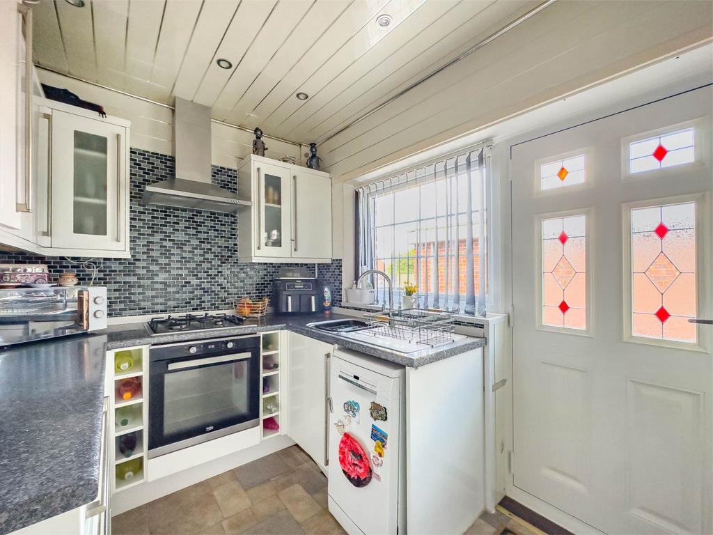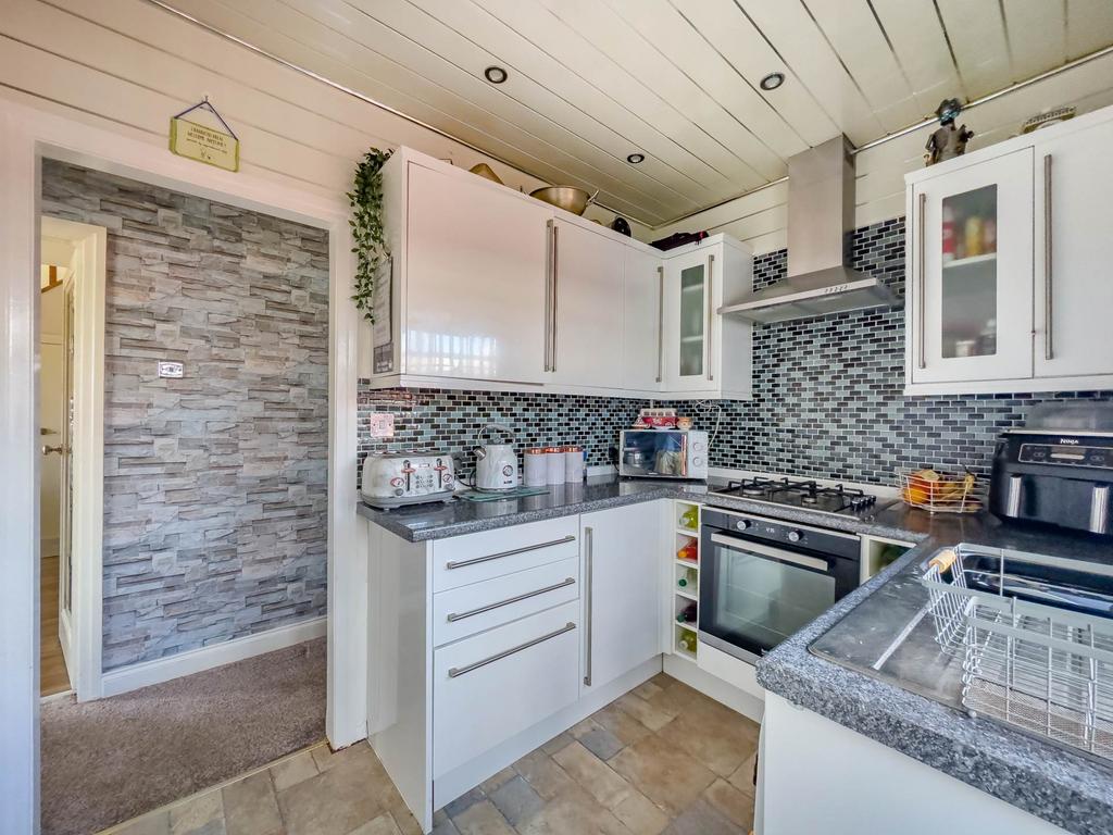 With a range of white high gloss base and wall units incorporating single drainer stainless steel sink unit. Integrated gas hob and electric oven. Plumbing for automatic washing machine and dishwasher.