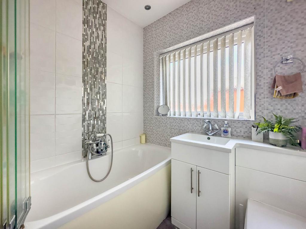 Fully tiled walls, three piece suite comprising bath with telephone style mixer tap. Vanity wash hand basin, low flush WC.