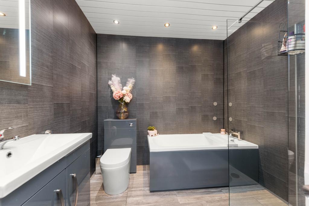 With a four piece bathroom suite comprising a low level W.C with concealed cistern, wash hand basin set into a suite a furniture, jacuzi style bath with mixer tap and shower attachment, walk in double shower with wall mounted thermostatic shower within, heated towel rail, ceiling light point and tiled flooring.