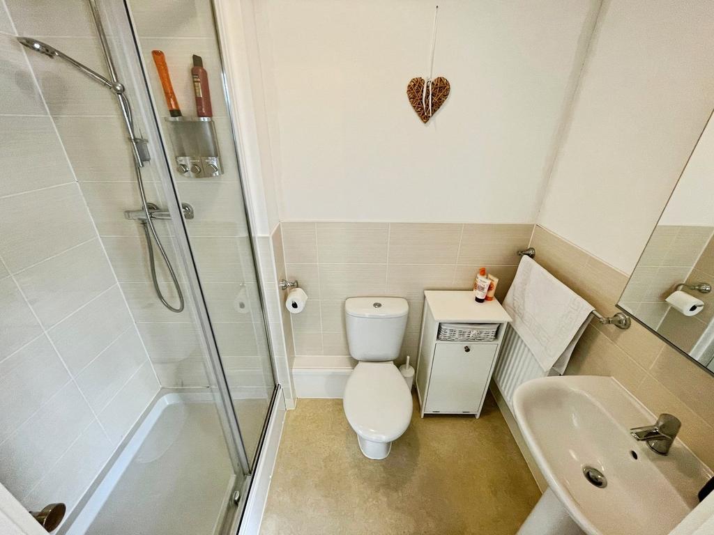 1.34m x 2.21m (4' 5" x 7' 3") Plastered and emulsioned ceiling with centre light, extractor fan, plastered and emulsioned walls with half height tiling, full height tiling around shower area, skirting and vinyl flooring. Three piece suite comprising pedestal wash hand basin with chrome mixer tap with wall mounted mirrored cabinet, low level w.c. and good size walk in shower with over head chrome mixer shower and sliding glass door.