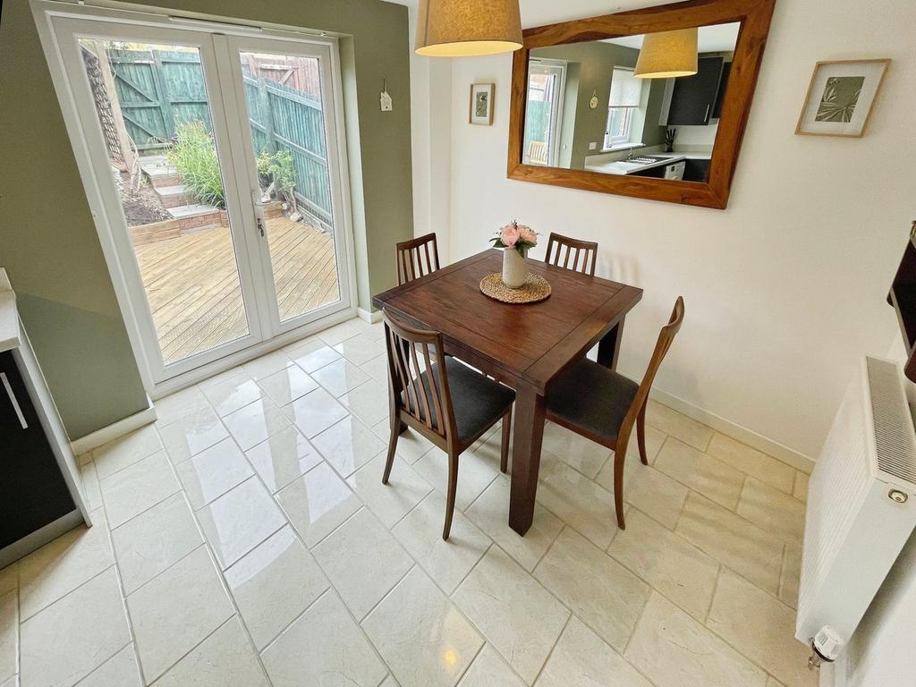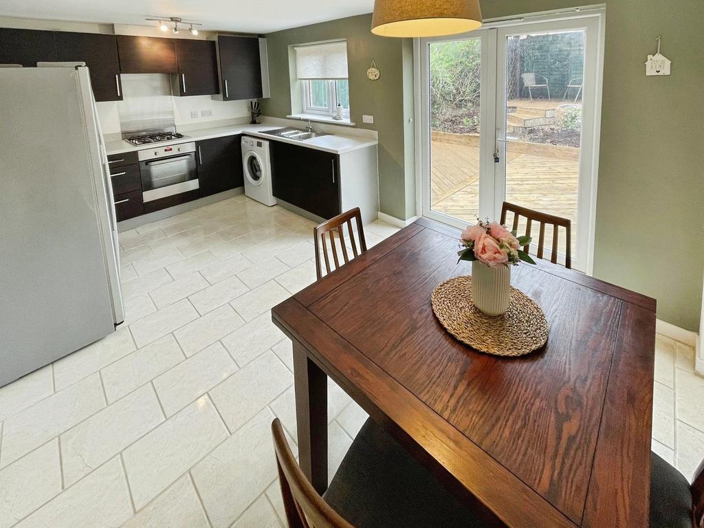 2.98m x 5.06m (9' 9" x 16' 7") Plastered and emulsioned ceiling with pendant light over the dining area and centre spotlight to the kitchen. Plastered and emulsioned walls, skirting and tiled flooring. A range of base and wall units with complementary roll top work surfaces housing an inset one and half stainless steel sink with chrome mixer tap. Inset four ring gas hob with stainless steel splashback and over head extractor fan. Intergrated electric oven, space for washing machine and space for large American style fridge freezer (to remain). Gas boiler housed in a kitchen unit and space for a dining table and chairs. Radiator, uPVC double glazed window overlooking the rear and uPVC double glazed doors leading to rear garden. Under stairs storage with hanging rails and stairs leading to the first floor.