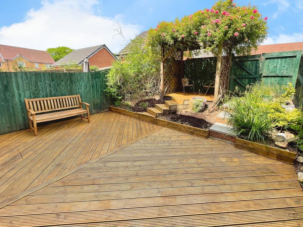 Paved path leading to the front door and driveway parking for one vehicle which leads up to the garage accessed via a traditional up and over door with power and lighting. Wall mounted light with sensor to the front door. Enclosed and private rear garden laid to decking with steps leading to a further area of decking with pergola, growing roses and mature shrubs in the beds. Outside tap. Gate leading to the rear.