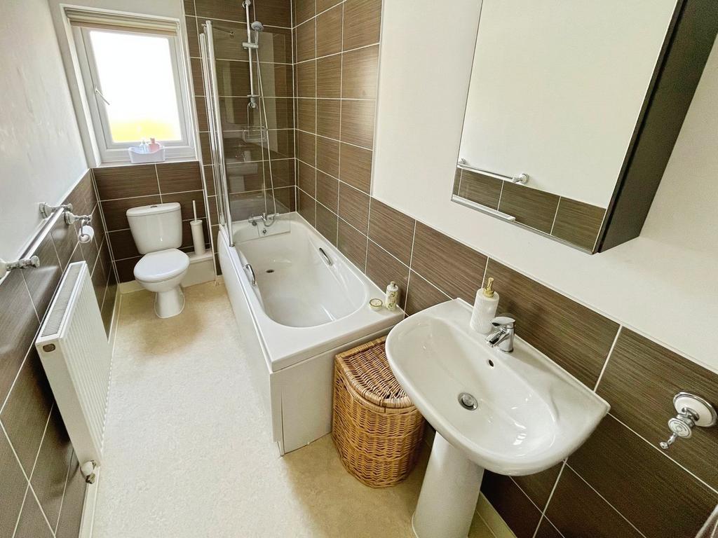 1.42m x 3.04m (4' 8" x 10' 0") Plastered and emusioned ceiling with centre light, plastered and emulsioned walls with half height tiling, full height tiling around bath and shower area, skirting and vinyl flooring. Three piece suite comprising low level w.c. bath with chrome mixer tap and over head chrome shower with folding glass screen and pedestal wash hand basin with chrome mixer tap. Wall mounted mirror cabinet, radiator and frosted PVCu double glazed window to the rear of the property. Storage cupboard with shelving.