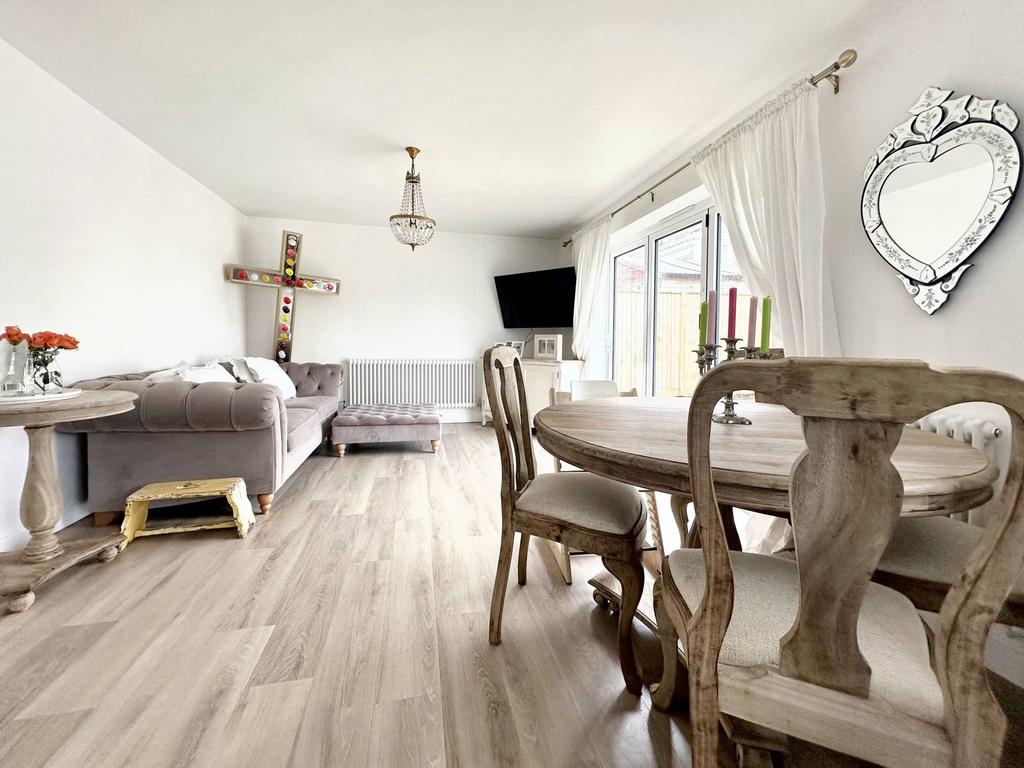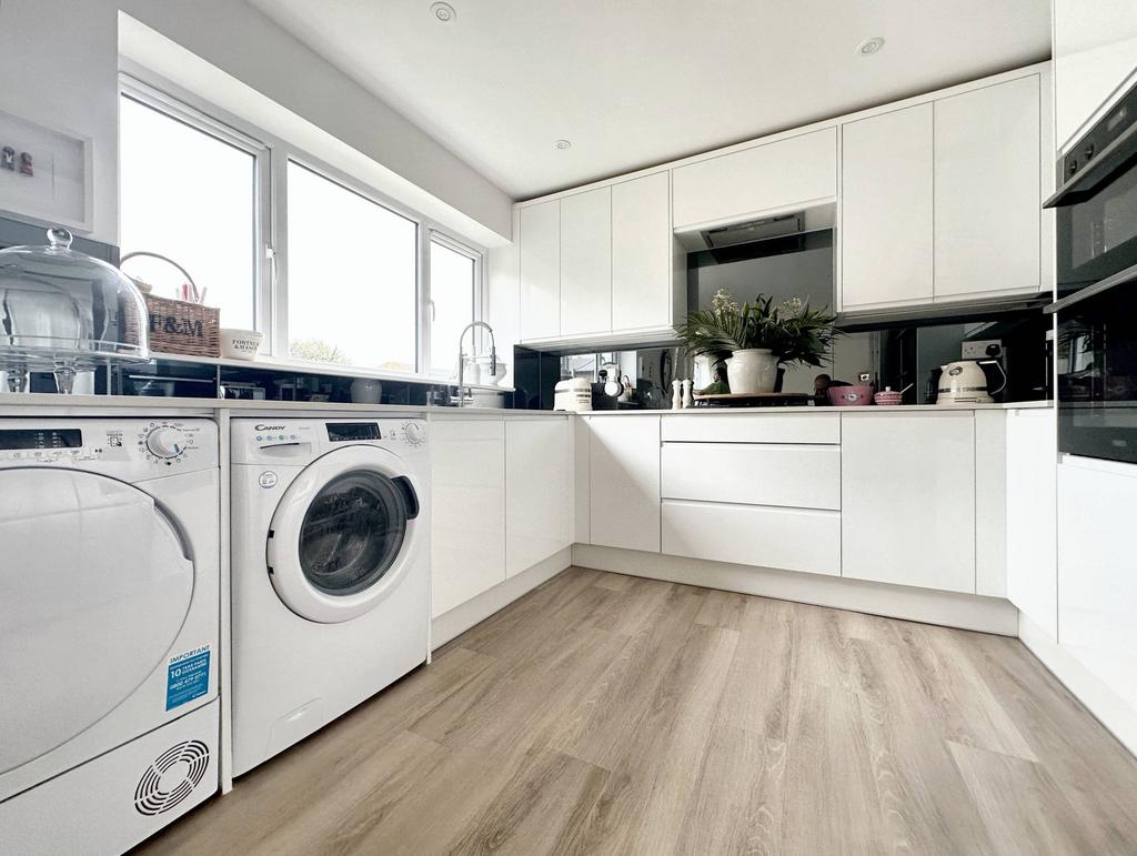 A new front door leads to a spacious hallway with hatch to the loft space and an attractive floor. The living room is a south facing room with a matching floor to the hall, a new ‘school’ style radiator and bi-fold doors to the rear garden. There is a also space for a dining table between the lounge area and the kitchen. The kitchen has been newly fitted with a modern high gloss white kitchen with a range of base cupboards and drawers, space for appliances and matching wall units. Between the two is an attractive smoked mirror splash back. There is a built in gas hob and double oven. Led lighting and feature coloured lighting and a window overlooking the rear garden.