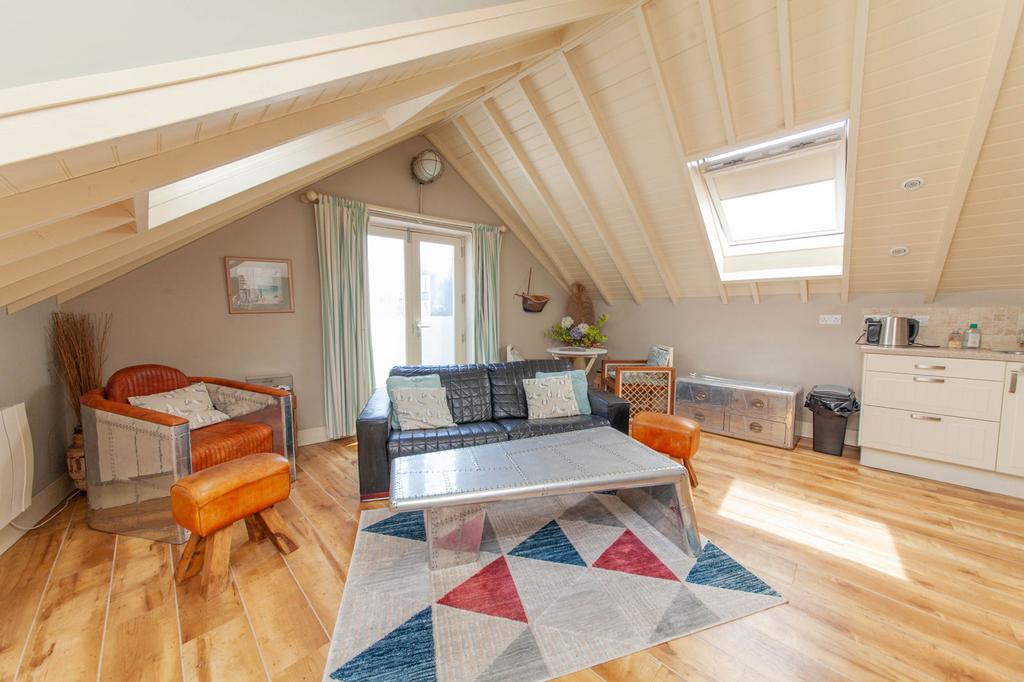 The first floor is a delightful open-plan living area, filled with natural light from three skylights and Juliet double doors that open to a southerly aspect, offering views across the town. The vaulted ceilings enhance the sense of space and character.