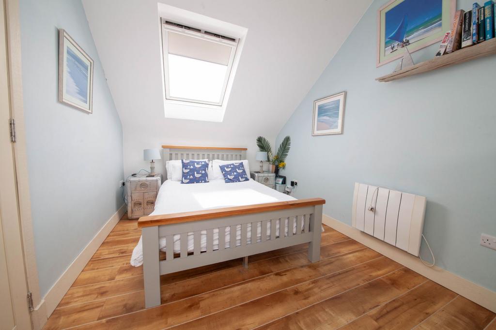 Bedroom one is a generously sized double room with a skylight and built-in wardrobe housing the hot water cylinder tank.