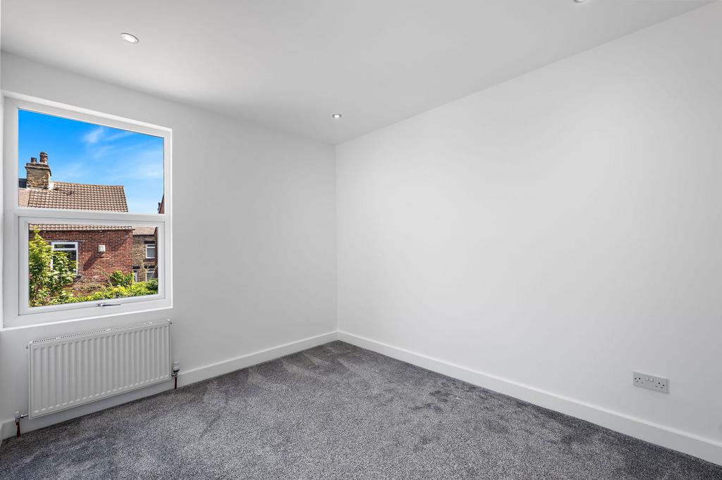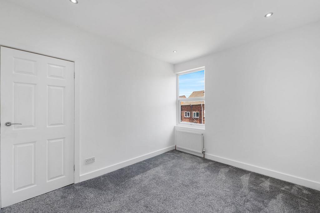 The second bedroom, located at the rear of the first floor, is the smallest of the three but still comfortably fits a double bed. It features a rear-facing UPVC double-glazed window, modern spotlights, and grey carpeting. Additional storage is available above the staircase, a practical space that could easily be used as a built-in wardrobe.