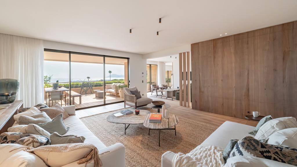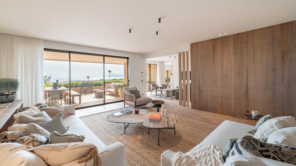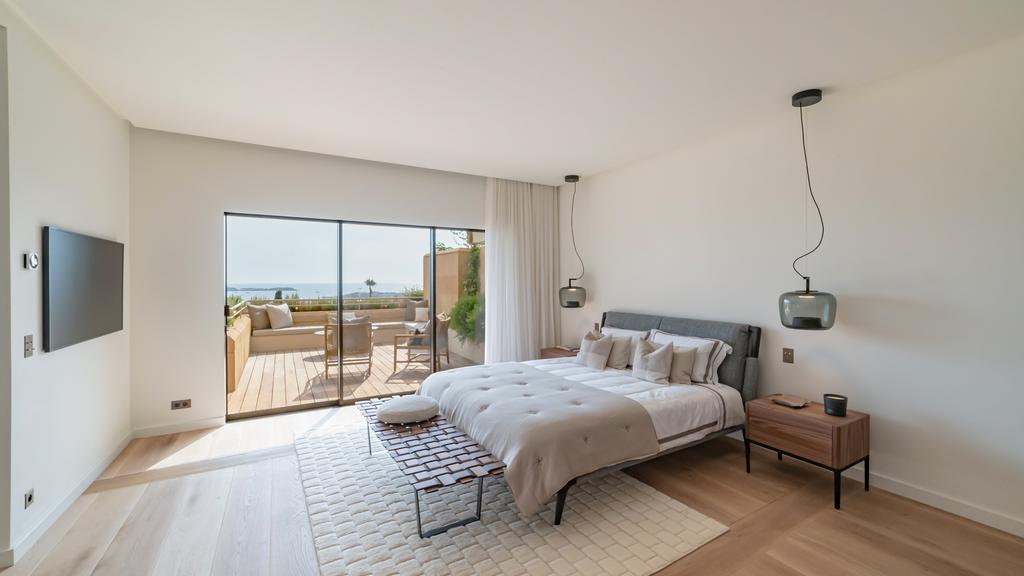 With a total surface of approximately 2,669 sq ft (248 m²) — including 2,314 sq ft (215 m²) under Carrez law and an independent 355 sq ft (33 m²) studio — this residence also features a stunning 646 sq ft (60 m²) terrace boasting uninterrupted panoramic views over the Mediterranean Sea and the Lérins Islands.