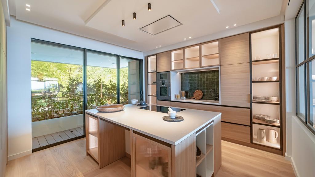 Sleek modern kitchen enclosed by a glass partition