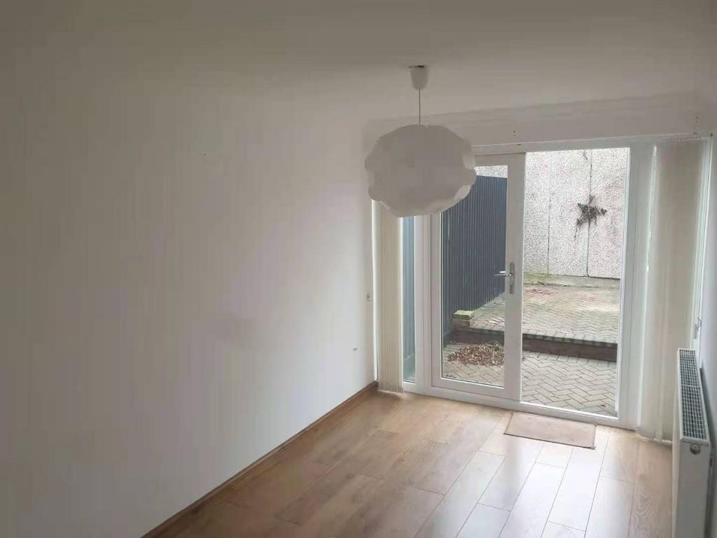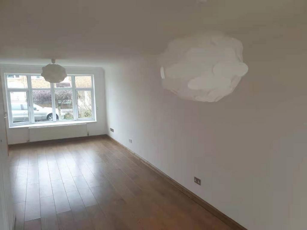 The property features three spacious bedrooms, a large reception room, and a contemporary high-gloss kitchen. The bathroom is modern and white, complementing the sleek design of the home.