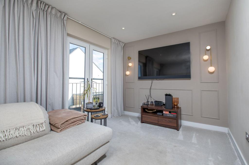 The first floor is dedicated to the stunning elevated living space which offers family living area which features a rear facing Juliette balcony, this area flows into the kitchen which is fitted with a smart range of wall and base level units with Quartz work surfaces incorporating a sink with drainer and mixer tap with ceramic tiled wall surrounds. There is an integrated range of appliances including a double eye line electric oven, induction hob which features an air extraction unit. There is a built in fridge, freezer and a dish washer. The kitchen then links through to a lovely bright dining area with French doors which open onto the relax roof terrace, an ideal outdoor space for lounge or grilling on the BBQ!
