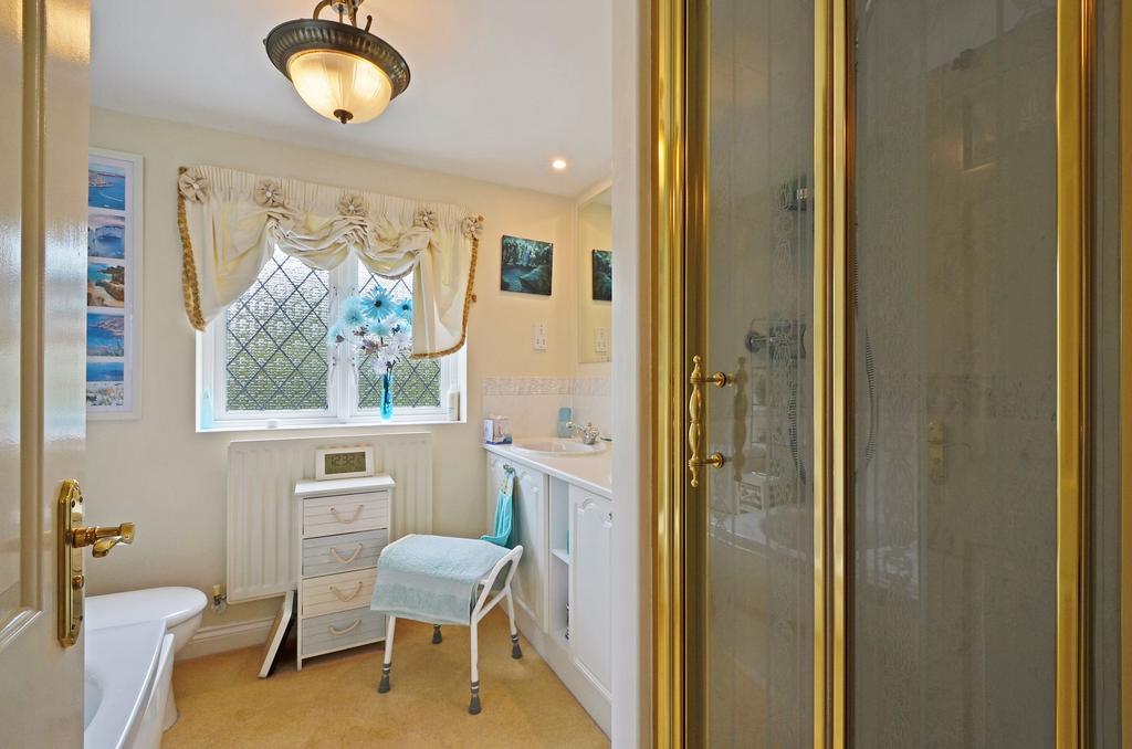 Fully tiled, fitted with a white suite vanity unit with cupboards and shelving, with lighting over, low flush WC, bath and separate shower cubicle, electric shaver socket and extractor fan. Window with opaque privacy glass.