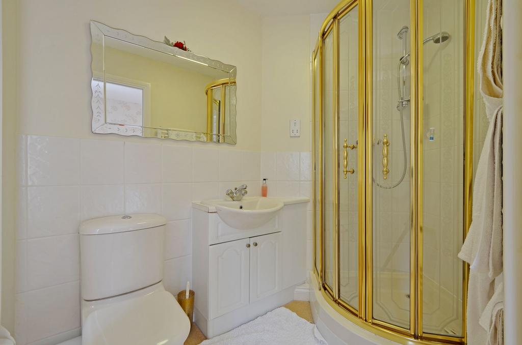 Fully tiled, fitted with a corner shower cubicle, low flush WC and wash hand basin in vanity surround with cupboards under. Electric shaver socket and extractor fan.
