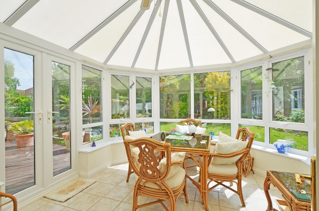 Superb Victorian style UPVC conservatory overlooking the rear garden with pitched roof. Ceiling fan with integral lighting, radiator and Tiled floor.