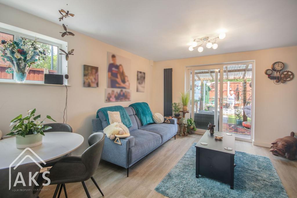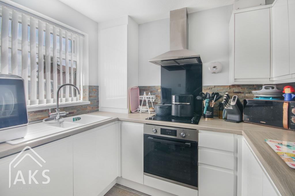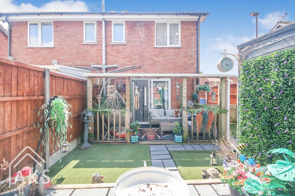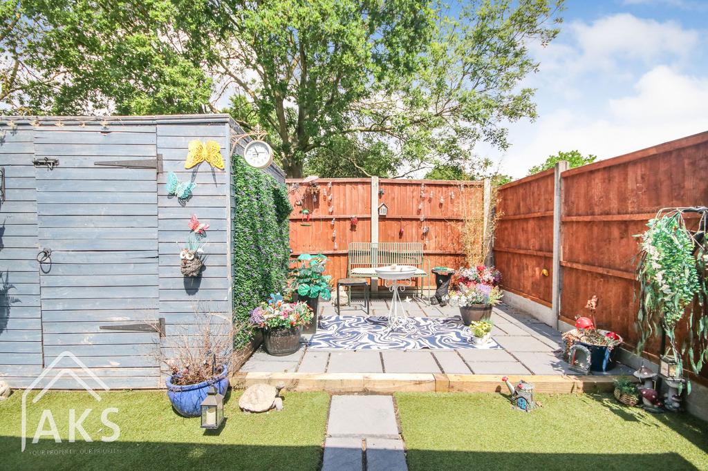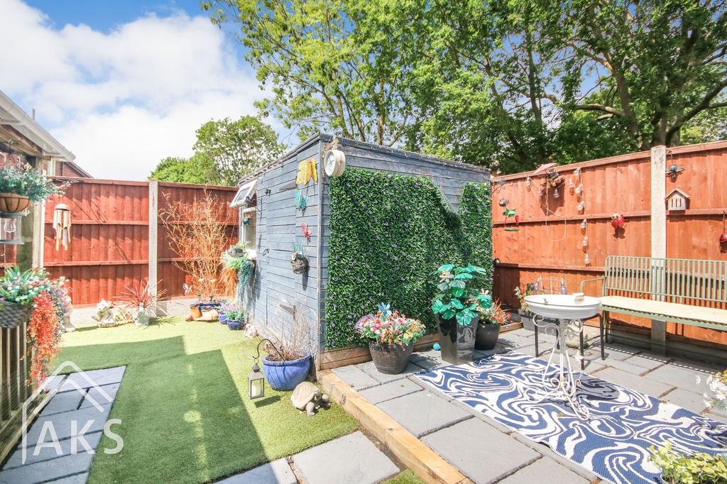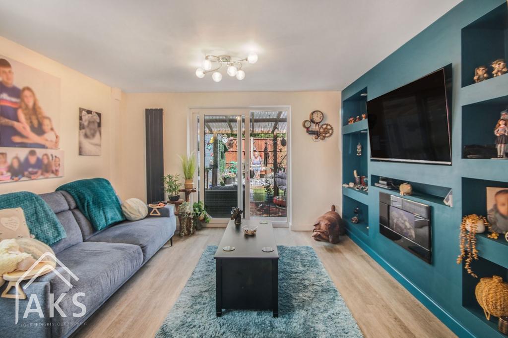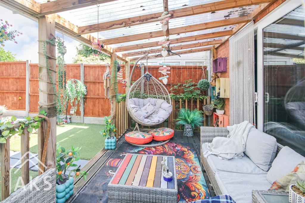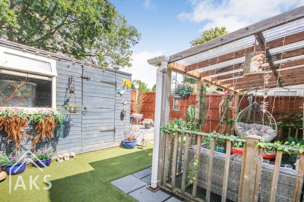 “This home has some great hidden extra’s! The living/dining room is a modern, bright and inviting space with large sliding doors and stylish media wall. The TV is custom fit to the space and can be left in place if you’d like! There are also integrated spotlights too, making this a real focal point of the room. The living/dining area has plenty of room for a large sofa as well as a 4 seater table. The light flows through into this area from the rear of the property through the sliding doors, overlooking the beautiful garden. The modern kitchen is located at the front of the house, newly refurbished only 2 years ago with a clean white gloss finish, integrated appliances and even a built in boiling water tap meaning you don’t need to clog the worktops with a kettle! Upstairs, the master bedroom is located at the front of the house with a large widow allow the light to flow in, there is plenty of room for a double bed as well as storage. The second bedroom is a good size too, with plenty of space for a single bed and storage. The family bathroom has everything you would need, including a shower over the bath. The current owners have made great use of the garden space, with the pergola from the back of the house creating a cosy undercover seated area, the artificial grass making it easy to maintain, the patio suntrap at the back, the large sheds for storing all your outdoor bits as well as an area sectioned off to the side of the house which is currently being used for for the dogs. This really is a great space, and what makes it better is there is nothing behind the home, other than the primary school field!”
