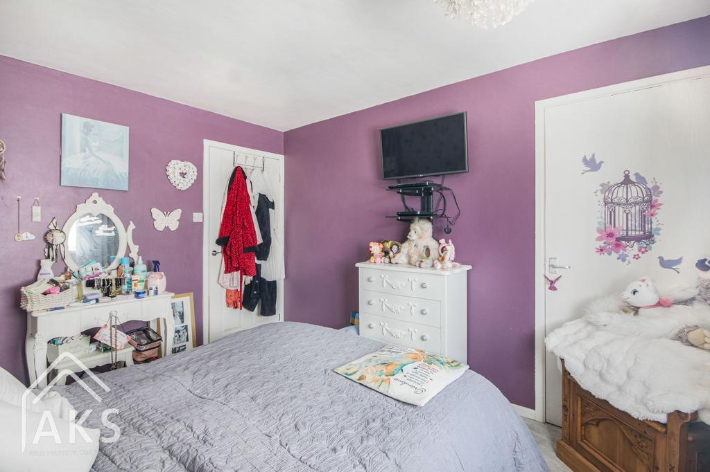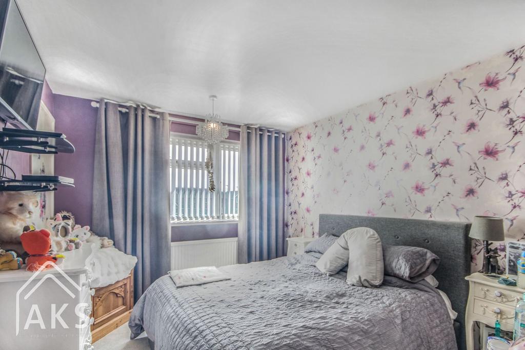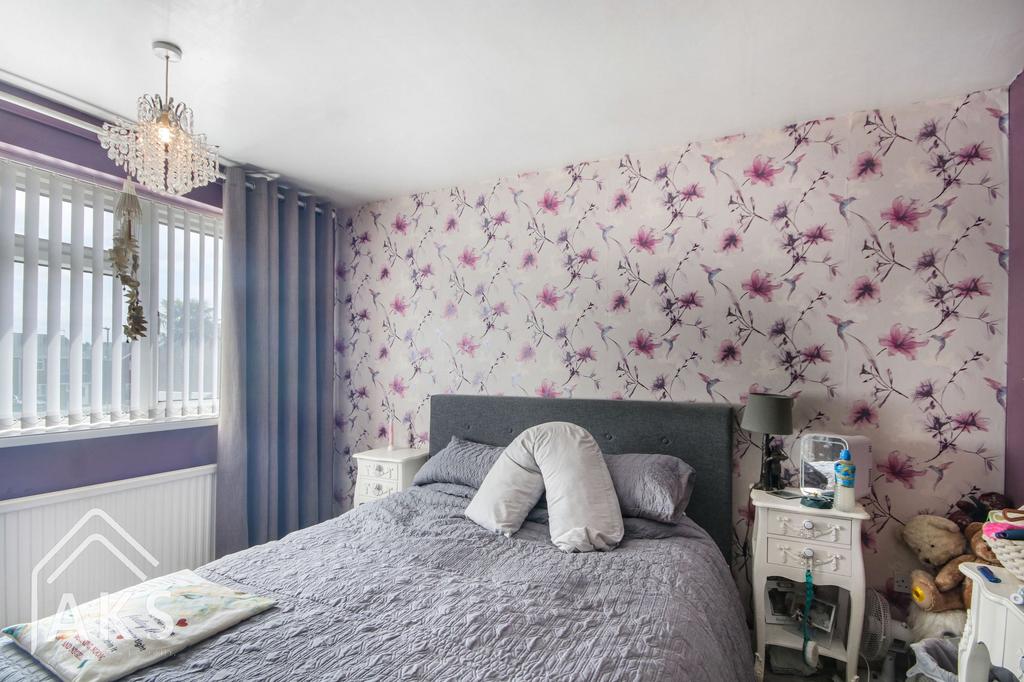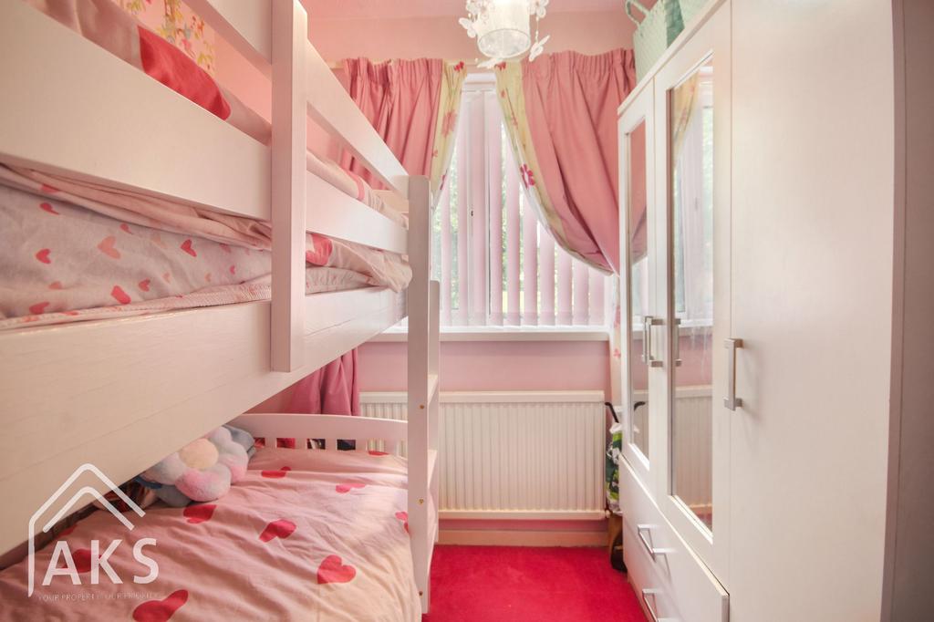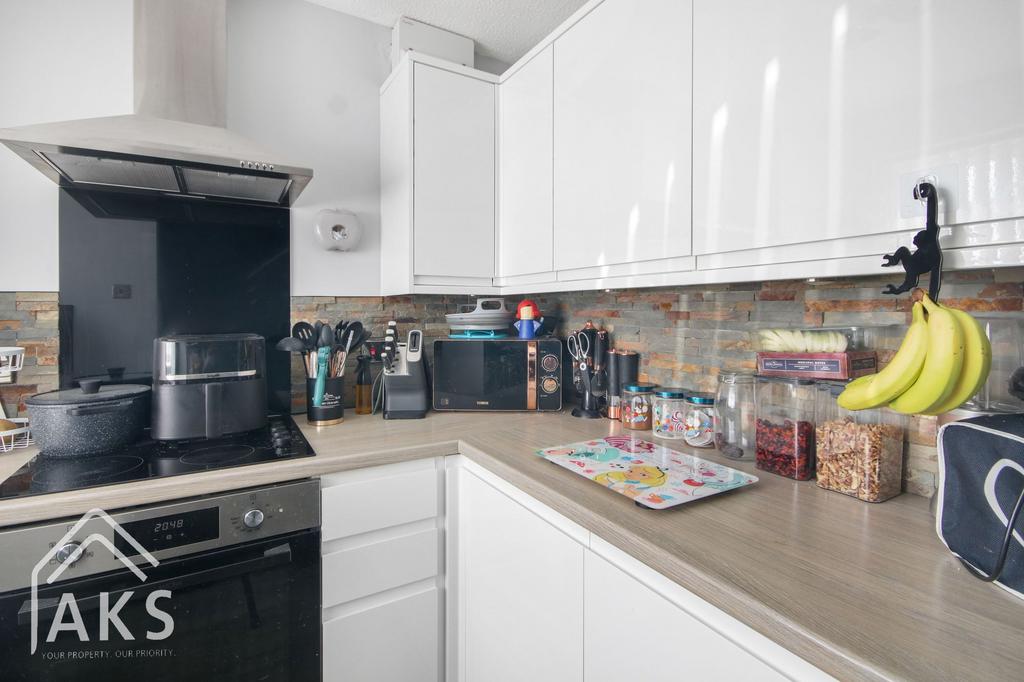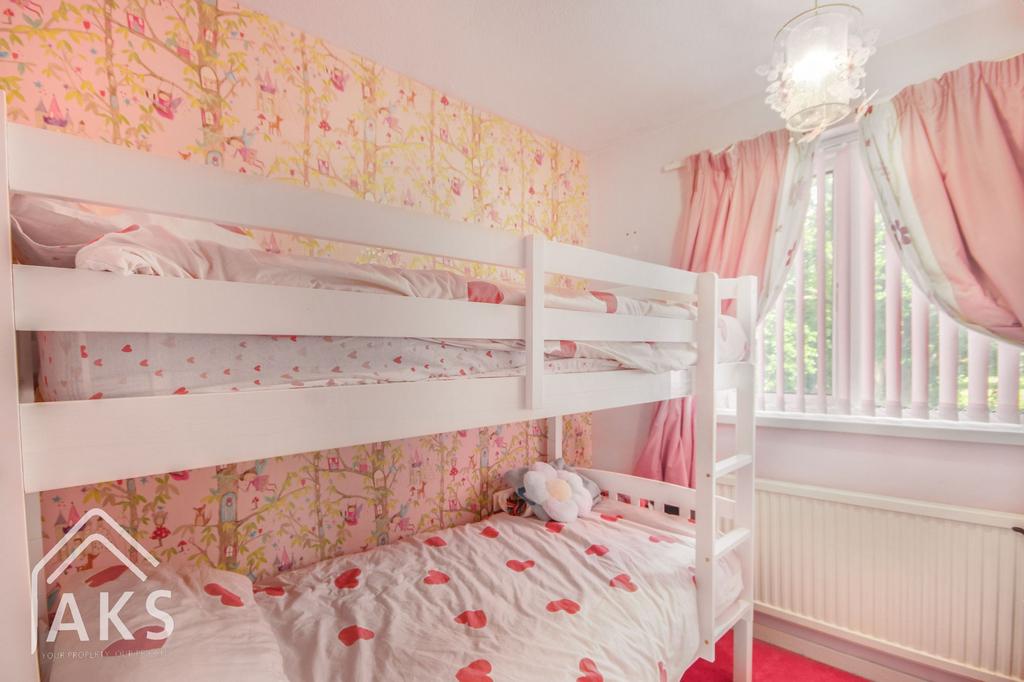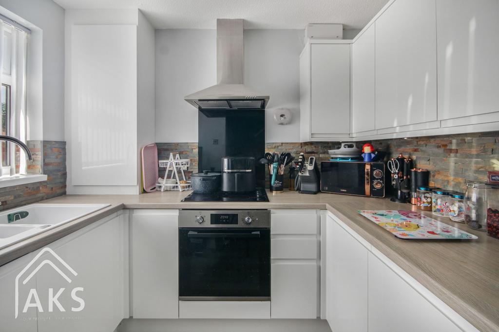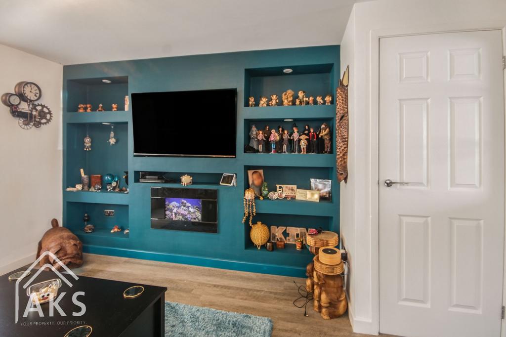 “This home has some great hidden extra’s! The living/dining room is a modern, bright and inviting space with large sliding doors and stylish media wall. The TV is custom fit to the space and can be left in place if you’d like! There are also integrated spotlights too, making this a real focal point of the room. The living/dining area has plenty of room for a large sofa as well as a 4 seater table. The light flows through into this area from the rear of the property through the sliding doors, overlooking the beautiful garden. The modern kitchen is located at the front of the house, newly refurbished only 2 years ago with a clean white gloss finish, integrated appliances and even a built in boiling water tap meaning you don’t need to clog the worktops with a kettle! Upstairs, the master bedroom is located at the front of the house with a large widow allow the light to flow in, there is plenty of room for a double bed as well as storage. The second bedroom is a good size too, with plenty of space for a single bed and storage. The family bathroom has everything you would need, including a shower over the bath. The current owners have made great use of the garden space, with the pergola from the back of the house creating a cosy undercover seated area, the artificial grass making it easy to maintain, the patio suntrap at the back, the large sheds for storing all your outdoor bits as well as an area sectioned off to the side of the house which is currently being used for for the dogs. This really is a great space, and what makes it better is there is nothing behind the home, other than the primary school field!”