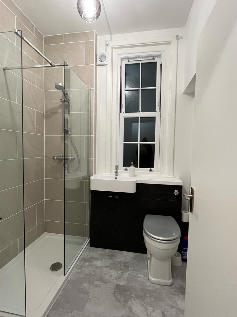 The contemporary shower room features a new walk-in shower, WC, sink, and a sleek all-in-one storage unit for added convenience.